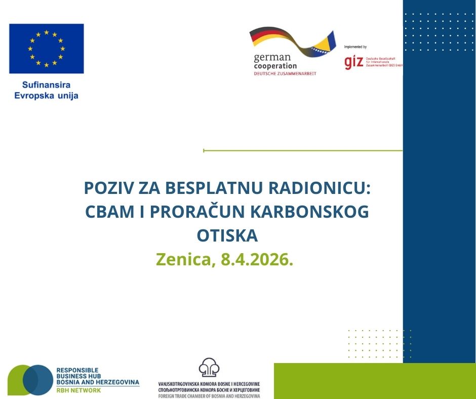 Centar za odgovorno poslovanje Bosne i Hercegovine (RBH BiH) pri Vanjskotrgovinskoj/Spoljnotrgovinskoj komori BiH nastavlja s organizacijom jednodnevnih stručnih radionica o CBAM mehanizmu i proračunu karbonskog otiska u bh. gradovima.