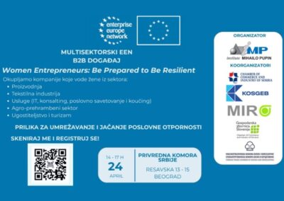 Vanjskotrgovinska/Spoljnotrgovinska komora Bosne i Hercegovine, kao koordinator BITNET konzorcija Evropske preduzetničke mreže u Bosni i Hercegovini i suorganizator događaja, obavještava i poziva poslovnu zajednicu na B2B događaj „Women Entrepreneurs: Be Prepared to Be Resilient“, koji će biti održan 24.4.2026. godine u prostorijama Privredne komore Srbije u Beogradu, u organizaciji Instituta Mihajlo Pupin i partnera EEN-a.