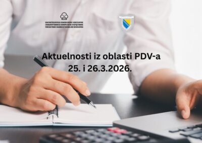 Vanjskotrgovinska/Spoljnotrgovinska komora Bosne i Hercegovine (VTK/STK BiH), u saradnji s Upravom za indirektno-neizravno oporezivanje Bosne i Hercegovine (UINO BiH), organizira dvodnevnu edukaciju „Aktuelnosti iz oblasti PDV-a“, koja će biti održana 25. i 26.3.2026. godine u prostorijama Komore u Sarajevu (Branislava Đurđeva 10).