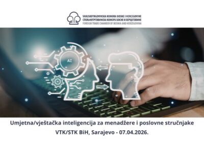 Vanjskotrgovinska/Spoljnotrgovinska komora Bosne i Hercegovine (VTK BiH) organizuje i ovim putem poziva zainteresovane predstavnike poslovne zajednice na edukaciju „Umjetna/vještačka inteligencija za menadžere i poslovne stručnjake“, koja će biti održana 7.4.2026.godine u prostorijama Komore u Sarajevu (Branislava Đurđeva 10), s početkom u 10.00 sati.