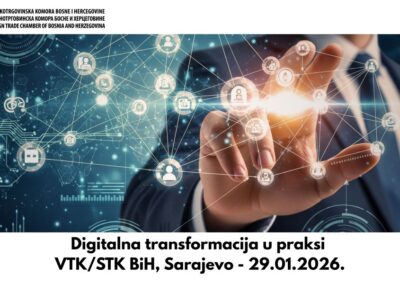 Vanjskotrgovinska/Spoljnotrgovinska komora Bosne i Hercegovine (VTK/STK BiH) organizuje i poziva zainteresovane predstavnike poslovne zajednice na edukaciju „Digitalna transformacija u praksi“, koja će biti održana 29.01.2026. godine u Sarajevu, u prostorijama Komore (Branislava Đurđeva 10), s početkom u 10.00 sati.