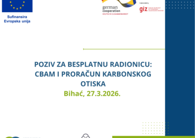 Centar za odgovorno poslovanje Bosne i Hercegovine (RBH BiH) pri Vanjskotrgovinskoj/Spoljnotrgovinskoj komori BiH nastavlja s organizacijom jednodnevnih stručnih radionica o CBAM mehanizmu i proračunu karbonskog otiska u bh. gradovima. Nakon održanih radionica u Banjoj Luci i Doboju, sljedeća radioca će biti održana 27.3. 2026. godine u Privrednoj komori Unsko-sanskog kantona u Bihaću.