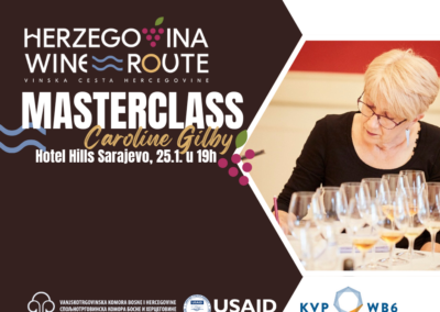 Po prvi put u Bosni i Hercegovini, Master of Wine Caroline Gilby iz Ujedinjenog Kraljevstva održat će ekskluzivni Masterclass posvećen vinima od autohtonih sorti s područja Vinske ceste Hercegovine. Ovaj jedinstveni događaj bit će održan u subotu, 25. januara 2025. godine, u Hotelu Hills u Sarajevu u 19.00 sati.  Sudionici će imati priliku kušati vina i uputiti se u bogatstvo vinske tradicije ovog posebnog regiona.