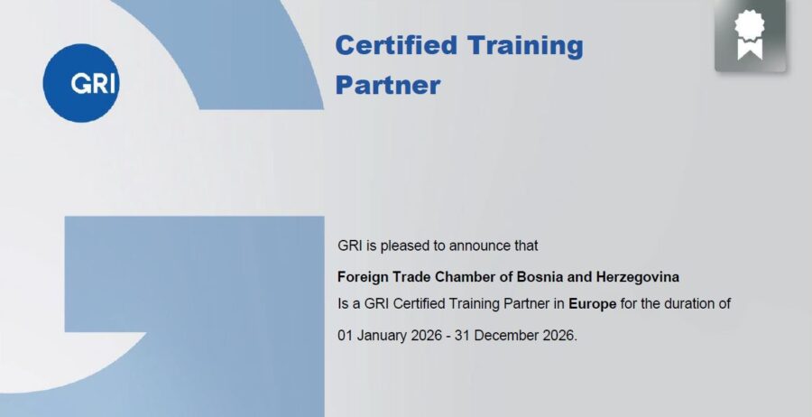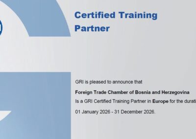 Nakon uspješno realizirane serije edukacija o ESG izvještavanju o održivosti (okoliš, društvo i upravljanje) u skladu s GRI standardima tokom 2025. godine, te ispunjavanja ugovornih obaveza iz Sporazuma sa Global Reporting Initiative (GRI), Vanjskotrgovinska/Spoljnotrgovinska komora Bosne i Hercegovine je potvrdila status GRI certificiranog trening partnera u Evropi za 2026. godinu.